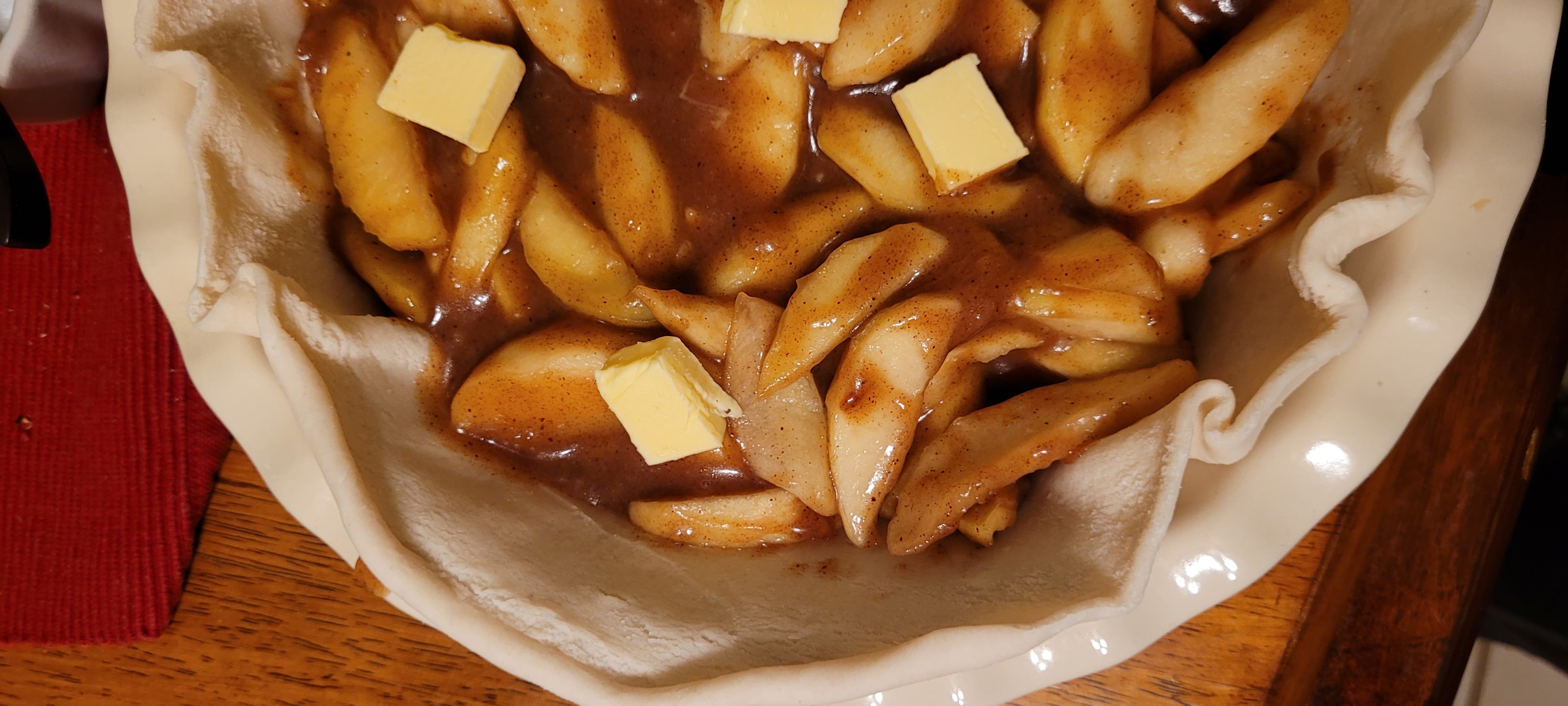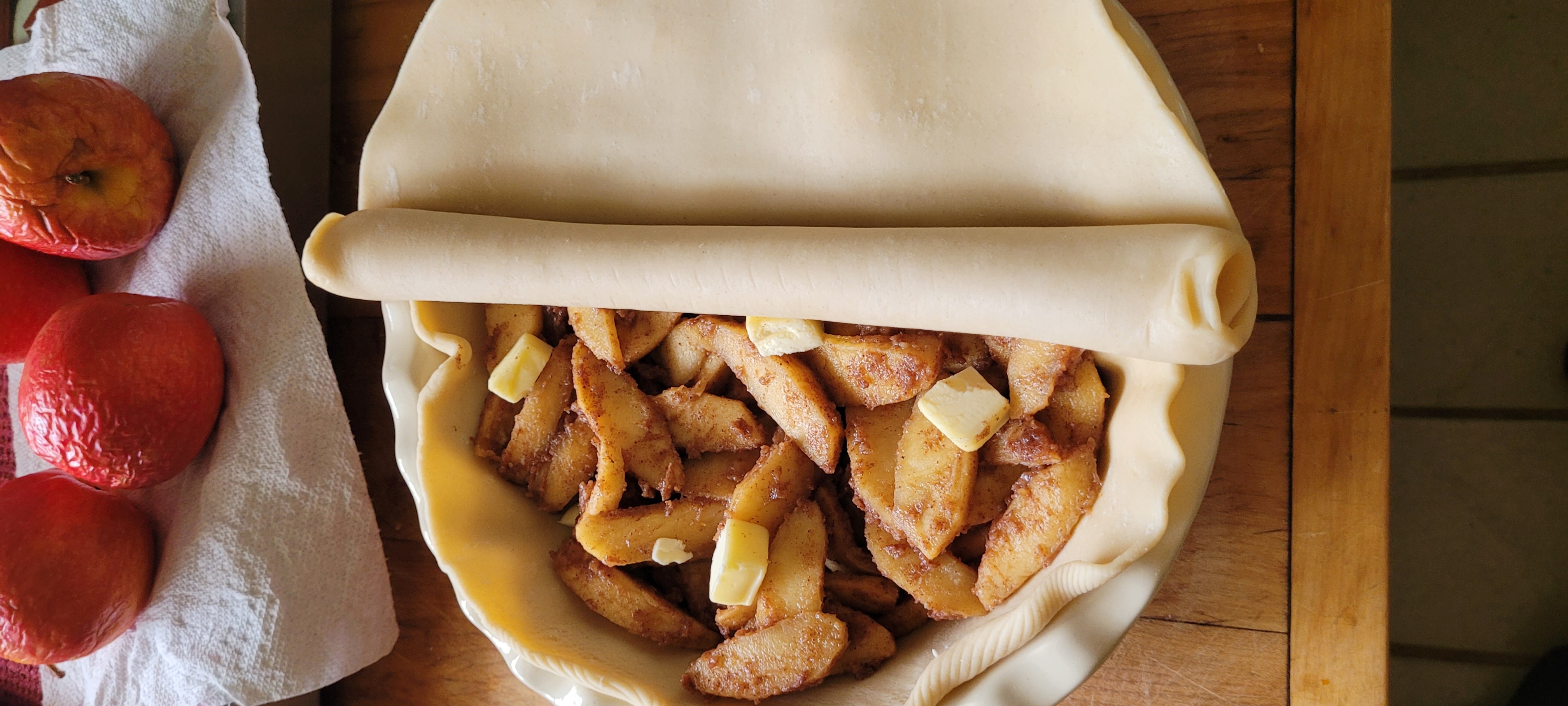 4. Dot the apples with small pieces of butter, then cover with the second pie crust. Seal and crimp the edges, and cut a few slits in the top for ventilation.